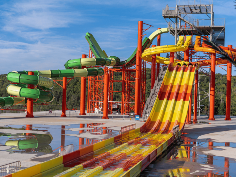 Quant au parc aquatique, les glissades d'eau permettent de faire le plein d'adrénaline et de rafraîchissement. En plus des populaires glissades, il y a une piscine à vague, une rivière tranquille, plusieurs jeux d’eau et de l’animation pour tous les âges.
