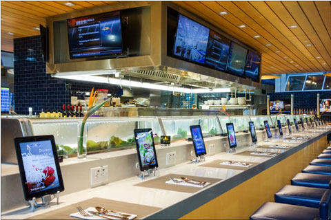 We see this technology, called kaiten custom, usually in sushi restaurants that lend themselves well to this concept. This is the case of the chain Yo! Suchi offering this service in all its branches worldwide. Customers settle on stools around a carpet on which mechanical scroll sushi platters. A color code identifies the price of the plate. The customer simply uses when it finds an appetizing dish. In Quebec, the Montreal Kyozon restaurant offers this solution to its customers in addition to offering traditional table service.