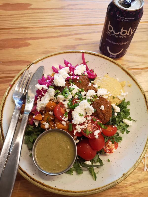 I quietly perused the menu and finally settled on the Israeli salad trio with sparkling soda water and energy balls to go. I didn't have to wait long before I received my appetizing colorful bowl. On a bed of tenderized kale and cooled cooked quinoa, were placed falafels still a little warm accompanied by sweet potatoes, cherry tomatoes, pickled beets and turnips, hummus and crumbled goat cheese. Honestly, what a delight! And what freshness! I was also very disappointed to be alone and not to be able to share how this meal completely fulfilled its mission. I was a bit skeptical about the “jalapeños-lime” vinaigrette, I am not a fan of spiciness, but my fears evaporated when I tasted this well-dosed delicacy.