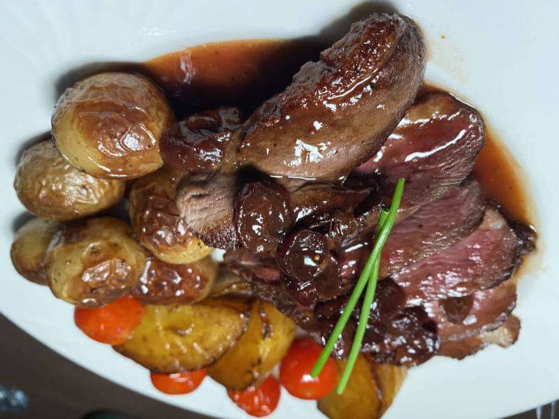 The only dissatisfaction was the cooking of the middle slices. While the end pieces were perfectly cooked, the middle pieces were more "blue" than rare. Not being a raw meat lover, I couldn't bring myself to eat these. As for the side dishes, the potatoes were tasty and well seasoned, without much originality. I found only one that could have benefited from more cooking, otherwise it was very good. The beets that were advertised as red on the menu were also very good, although in too large a quantity for me. I like this vegetable, but in moderation. As for the onions, I didn't really understand their purpose. I don't get much pleasure from eating sliced onions alone.