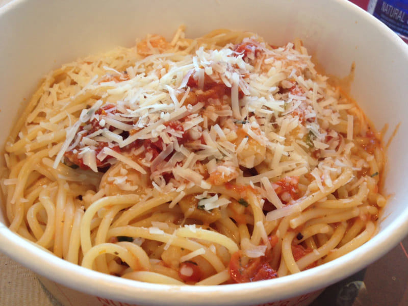 It took me a while before making my choice, since all the pasta dishes looked delicious. And I was not the only customers in front of me seemed too immersed in a complex decision-making. However, I have been able to eliminate a few, because for me, supporting a food must contain sufficient protein. Unfortunately, some pasta made me the eye, but do not contain meat or fish, such as papardelles with wild mushrooms and roasted garlic. I finally settled for spaghetti shrimp and dried tomatoes. Once the order is placed, we were offered a choice of three toppings: parmesan, arugula and shallot. I admit I was a little disappointed not to be able to add more than one without paying extra.