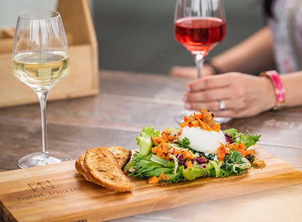 Ouvert depuis 2019 sur l’Île d’Orléans, Saint Pierre Le Vignoble propose depuis peu une offre alimentaire gourmande pour sustenter sa clientèle, venue faire un arrêt pour déguster ses produits. Pour l’occasion, Mme Christiane Grégoire et M. Jacques Blouin, propriétaires et viticulteurs, ont collaboré avec le réputé chef Laurent Godbout pour créer deux planches signatures, dont les produits se marient parfaitement avec les arômes des vins de la maison.