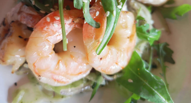Salade de fenouil et concombres au citron, crevettes grillées et sésame, 16$