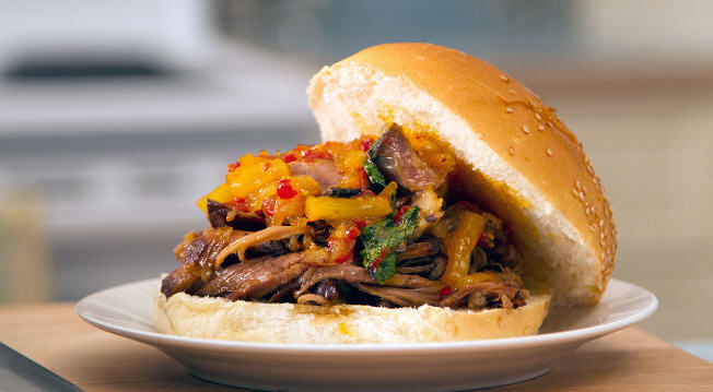 6- Garnir généreusement notre sandwich au jambon effiloché et servir